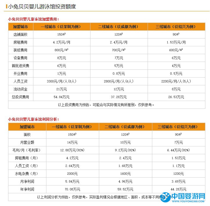 許多人對這個費用的來源不是很明白,大家可以參考表格。不管是區域經濟狀況,還是自身的投資實力,這都影響著實際的加盟費,下表就詳細說明了小兔貝貝嬰兒游泳館加盟費的詳細情況,大家參考一下。