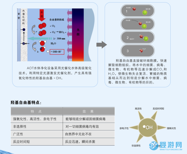 賽弗利AOT無菌泳池專用設備工作原理示意圖 從原理上可以看出,其滅菌過程是將水體中的細菌、微生物、有機污染物等直接分解。賽弗利AOT無菌泳池專用設備反應生成氧化能力極強的自由基,如·OH,其中·OH 的氧化能力是水體中存在的氧化劑中的,可將水體中有機污染物、細菌、病毒等微生物,最終降解為CO2、H2O。